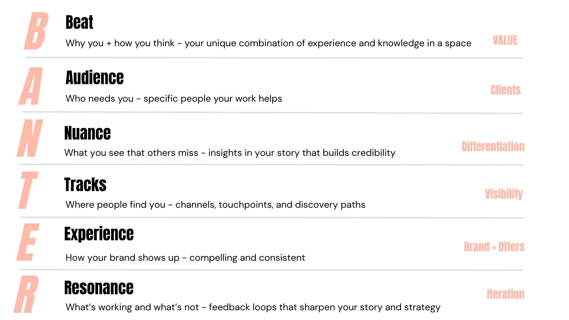 I developed BANTER to help women entrepreneurs build a strong foundation for business development and marketing. It’s not a checklist—it’s a thinking system that keeps your efforts focused and intentional, anchoring your positioning, audience, content, channels, and offers to your “why.”